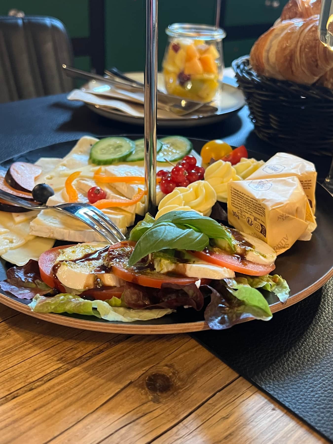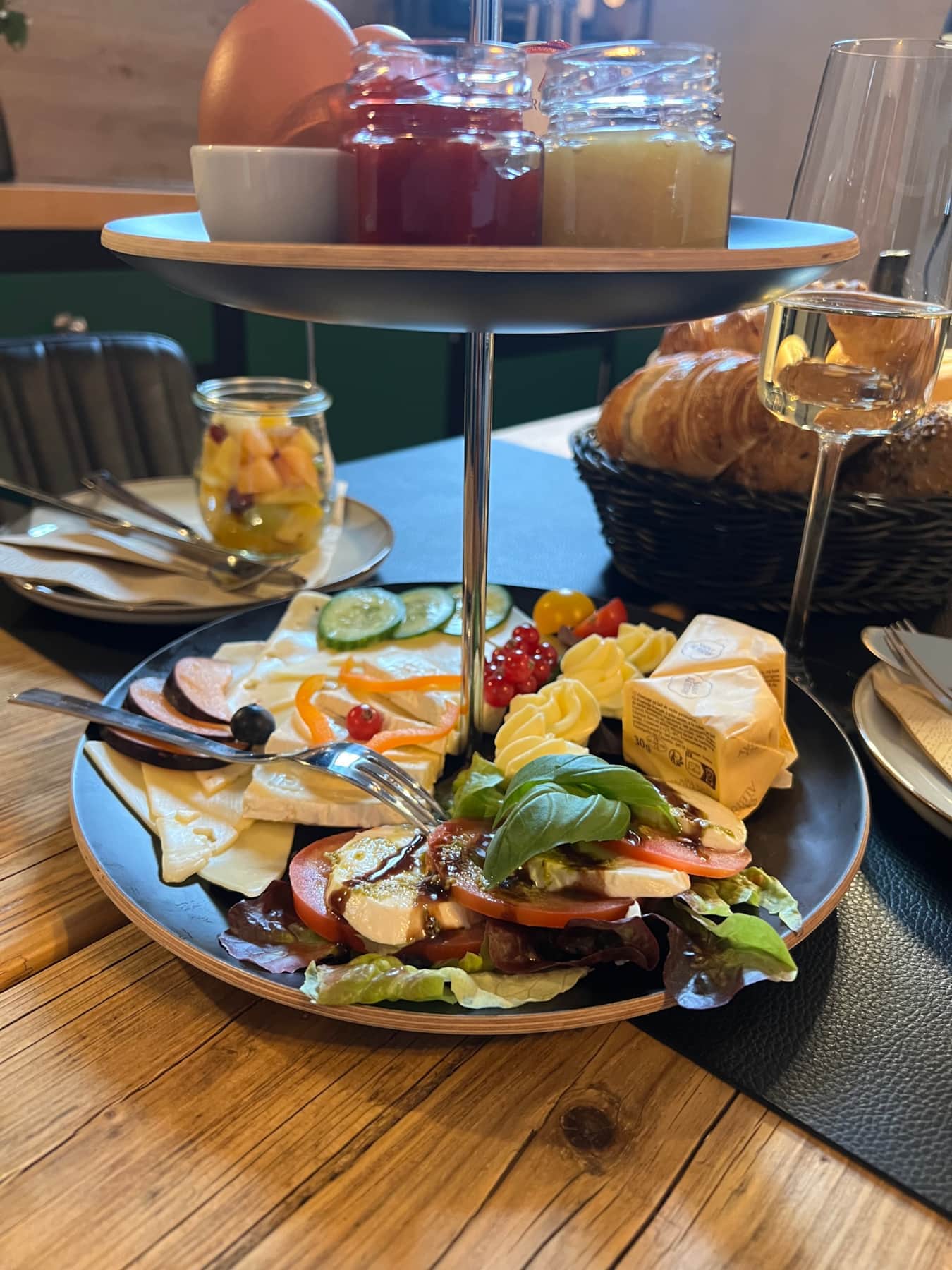 Das Frühstück wird direkt zur Suite geliefert – liebevoll angerichtet in einem Korb mit Etagere, wie auf den Fotos zu sehen.